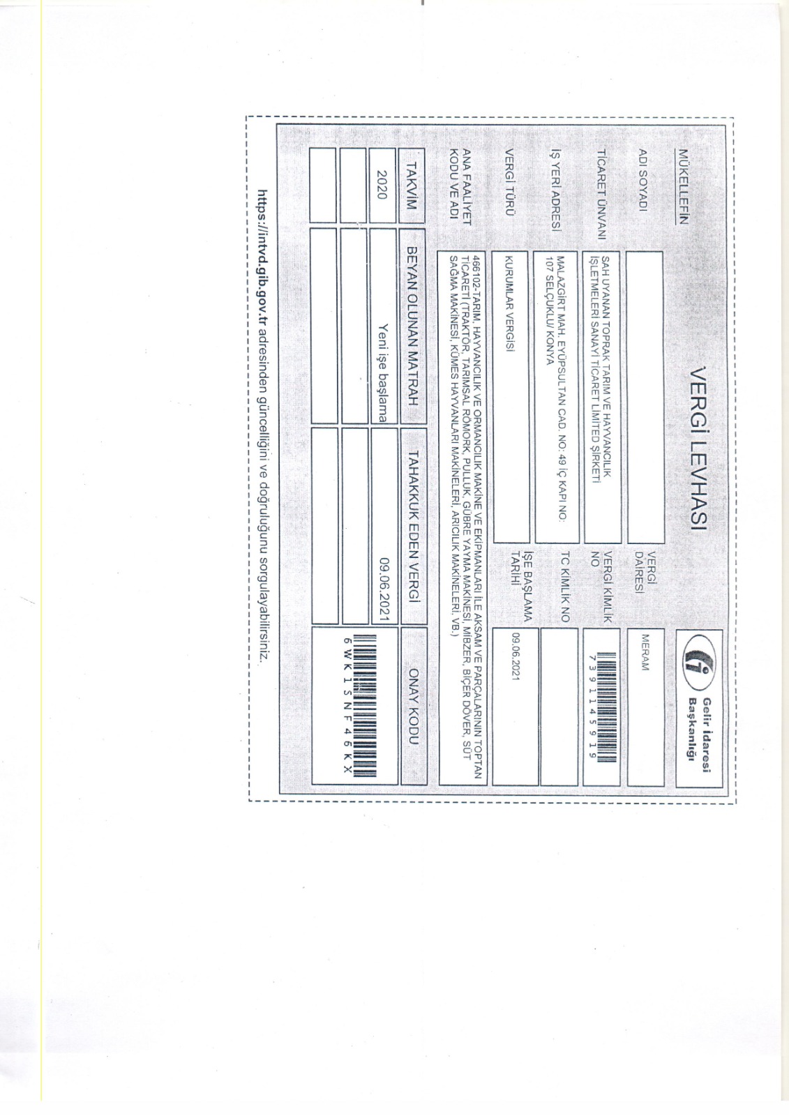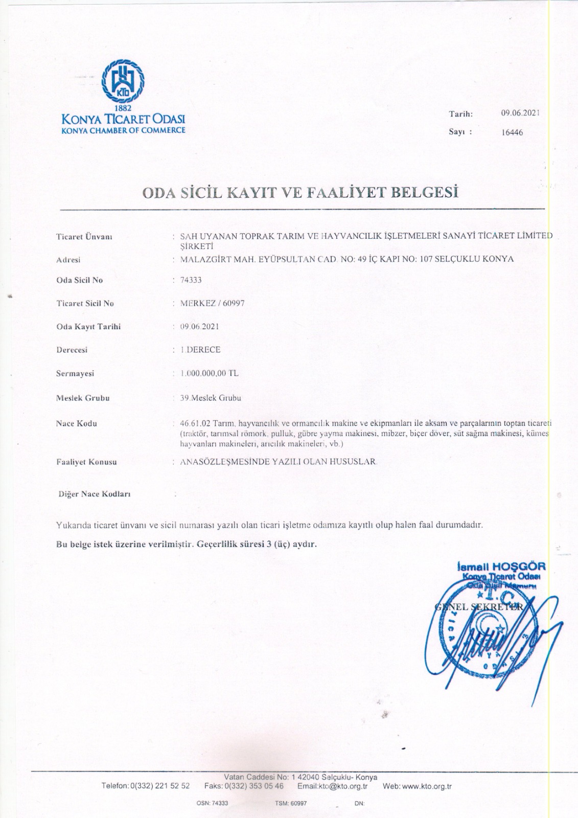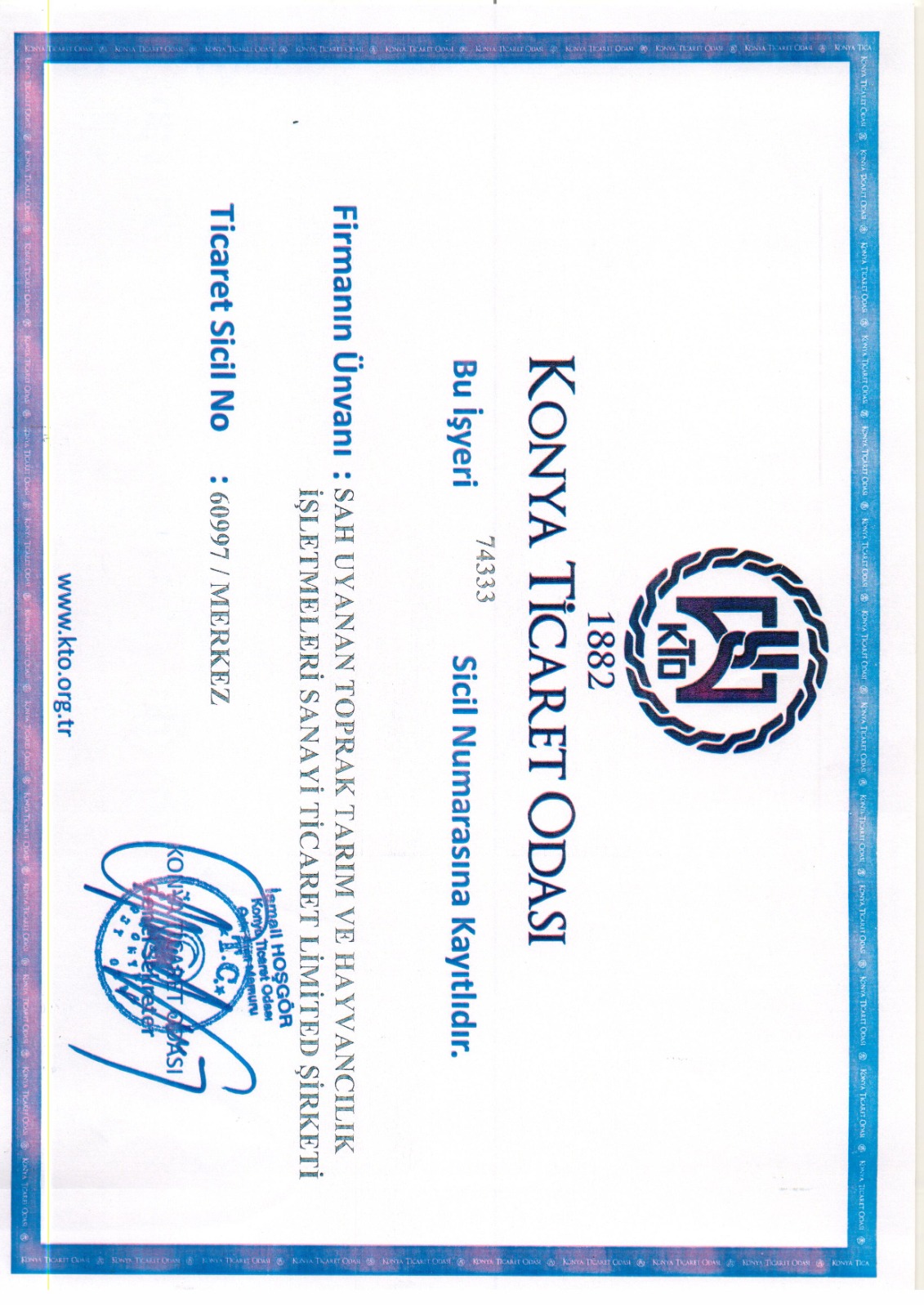 Konya Ticaret Odası Kayıt Belgesi